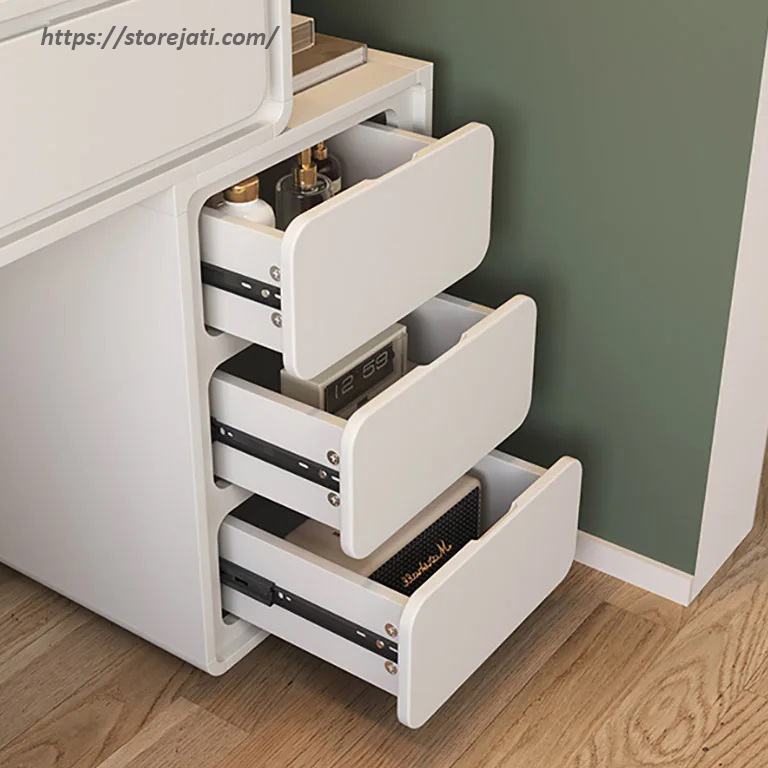 Meja rias pengantin minimalis perabot furniture yang idealnya di butuhkan untuk setiap wanita karena mereka suka dengan mempercantik diri, selian itu perabot furniture ini berfungsi untuk dekorasi kamar tidur rumah. memiliki laci berukuran besar berarti ruang yang cukup untuk tempat menyimpan alat make-up dan aksesoris lainnya seperti alat pengeriting rambut, alas bedak, lipstik, dan semua kosmetik anda akan terbebas dari kekacauan serta tertata rapi. ruang penyimpanan yang besar memungkinkan Anda menyimpan semua produk perawatan kulit, kosmetik, perhiasan, dan perlengkapan kecantikan lainnya. desainnya sangat simpel atau minimalis namum memiliki banyak laci penyimpanan. serta dipercantik dengan lapisan cat duco putih sehingga dapat memberikan kesan lebih cantik bagi interior kamar anda. karena desainnya simpel dan memiliki ukuran yang cukup besar, dan pastinya akan cocok untuk pasangan suami istri. produk furniture yang satu ini bisa anda gunakan jika karier anda di bidang kecantikan dan make-up artis, maka dari itu kami Storejati produksi furniture modern terbaru meja rias minimalis dan harganya murah model elegan dari kayu mahoni TPK Perhutani oven dimana proses oven kayu membutuhkan waktu 12 hari agar konstruksi kayu benar-benar kering dengan kadar air mencapai 12 sehingga produk furniture memiliki kualitas bagus. produk furniture kami terbuat dari bahan baku pilihan kualitas terbaik.